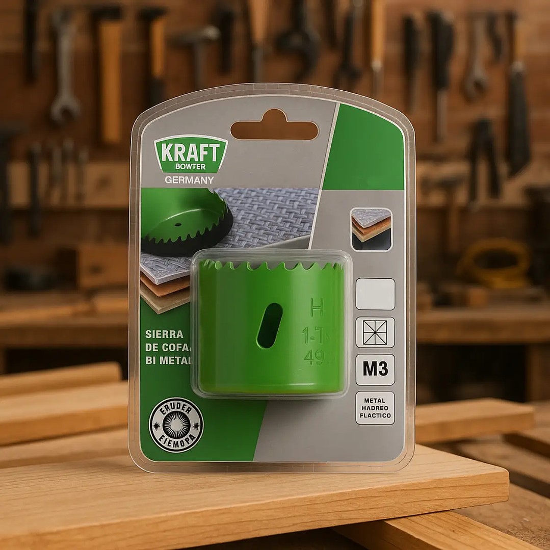 La sierra copa Kraft Bohrer ha sido desarrollada para aplicaciones exigentes que requieren precisión, durabilidad y eficiencia de corte. Fabricada bajo estándares de calidad alemanes, es ideal para perforaciones limpias en materiales como madera, plásticos, acero delgado, aluminio y placas de yeso.